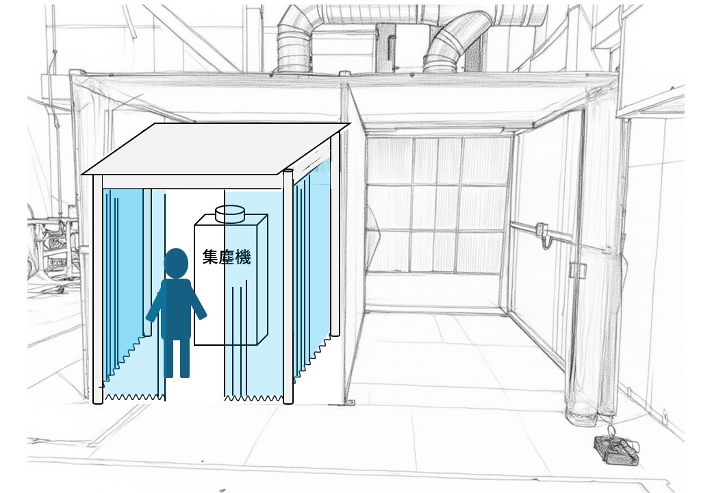 発生する粉じんの粒径が均一ではなく、プッシュプル型換気装置の制御風速(0.2m/s)ではすべての粉じんを吸い込むことは難しい状況でした。
