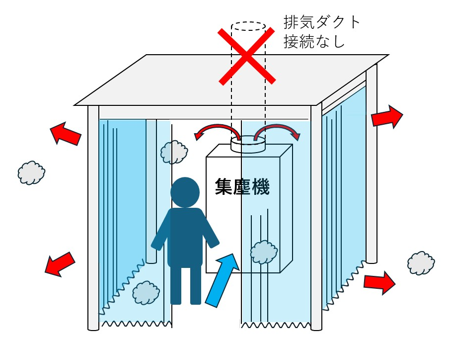 ・さらに集塵機の排気が屋外へ接続されておらず、屋内に排気されていたため、作業中はブース周辺が粉じんで白く煙るような状態になっていた。