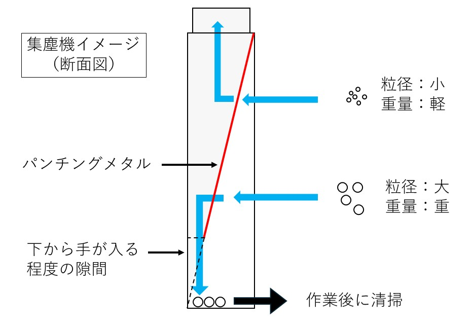 ②粒径の大きい重量の重い粉体はパンチングメタル下部へ落下するようにして、作業後に人の手で清掃を行う