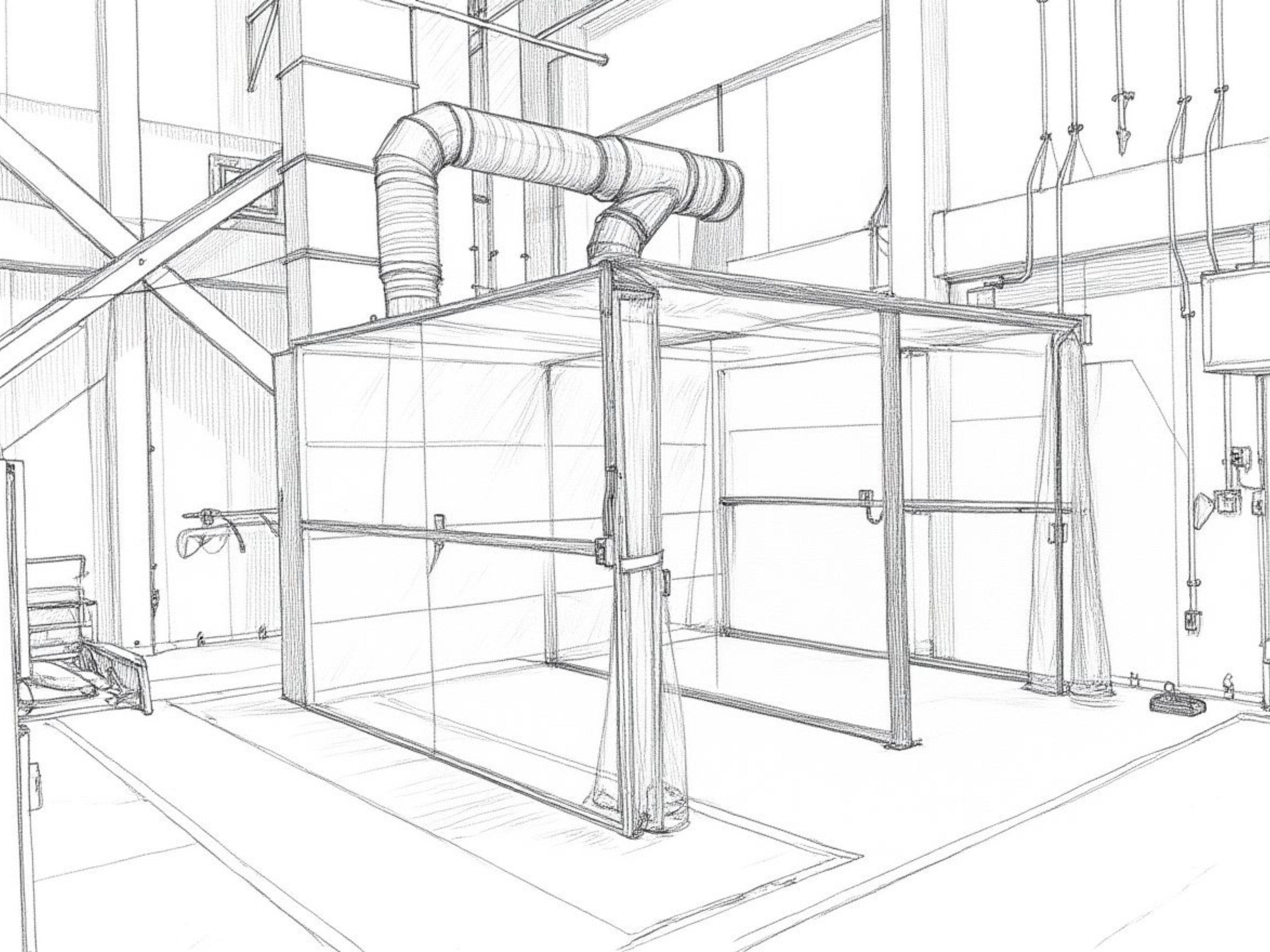 局所排気ブースの外装を透明なシートで施工し、局所排気ブース内に防塵型の照明やコンセントを設置することで明るさの確保と作業性の向上を図りました。