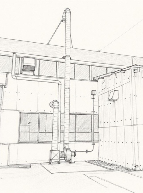 工場内にあるコンテナハウス(左)から屋外へダクトを設置しました。