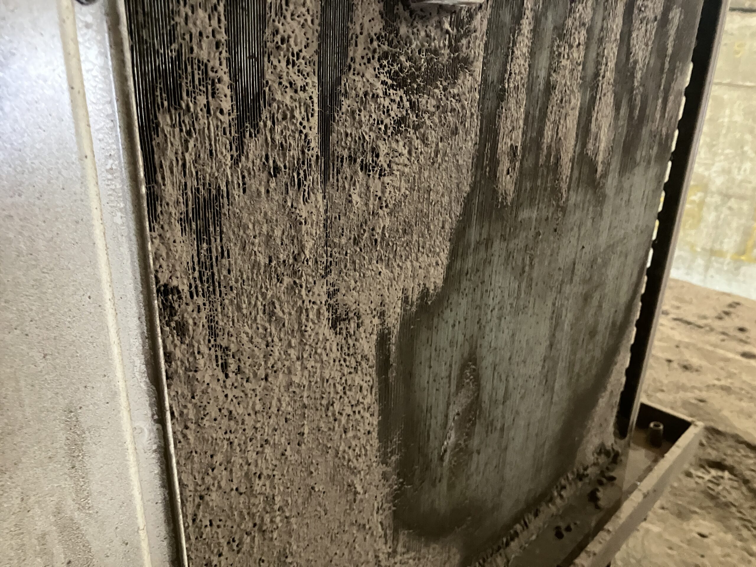 詰まっている状態:ホコリやゴミでフィンが塞がると、風が通り抜けられず熱を外に捨てられなくなる。