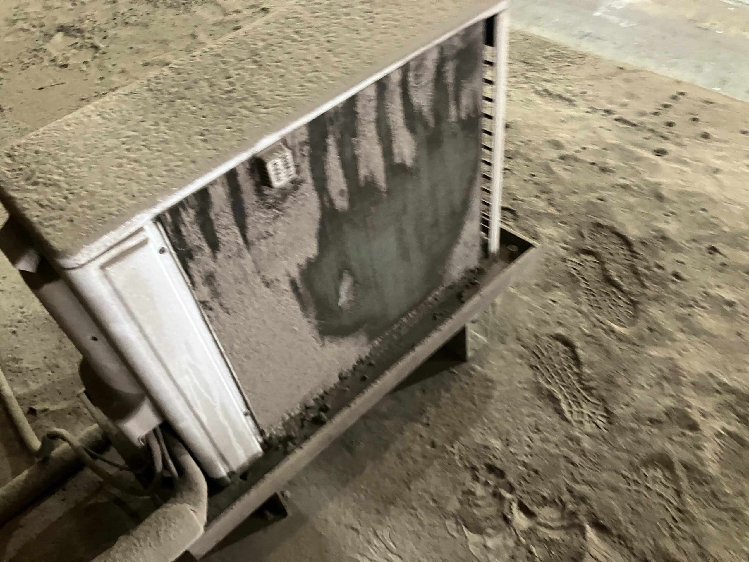 その電気室の建屋上に室外機を設置しているため、ホコリや砂塵などで室外機のフィルター(熱交換器)が汚れ、高圧圧力が高すぎる状態でした。