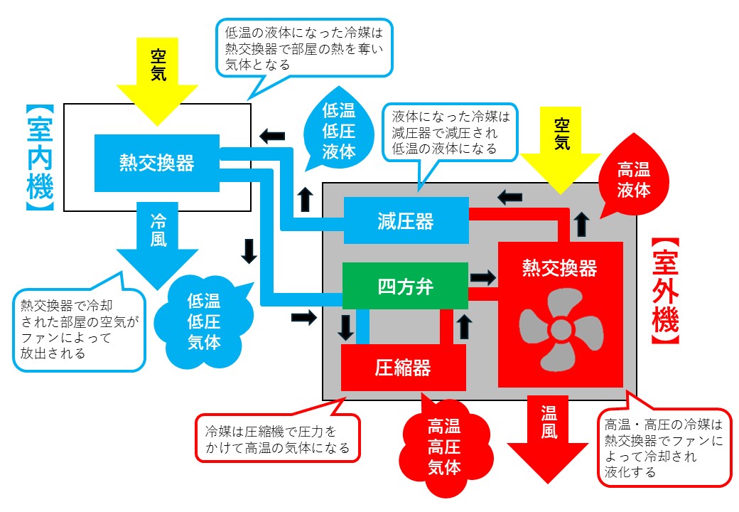・冷媒が冷えないまま室内機に戻ってしまうと、室内機で「熱を吸い取る」という反応が起きにくくなります。